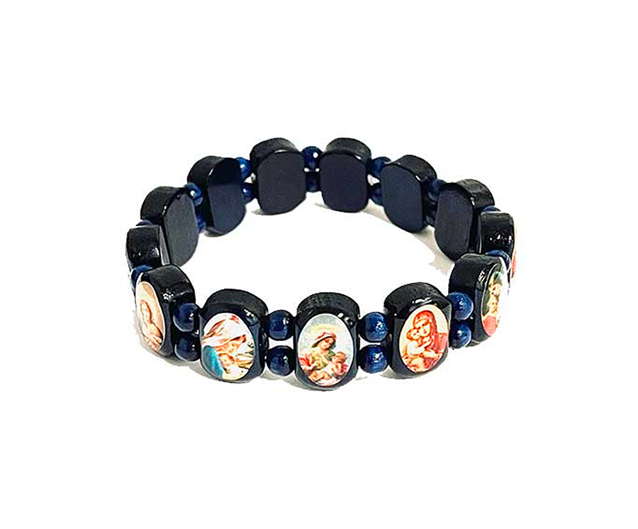 Blue Brazilian Wood Bracelet with various Madonnas and Child. 1/2″ in height, stretchable, fits mosts wrists 6 inches to 8.5 inches. Double corded with sturdy jewelry cord.