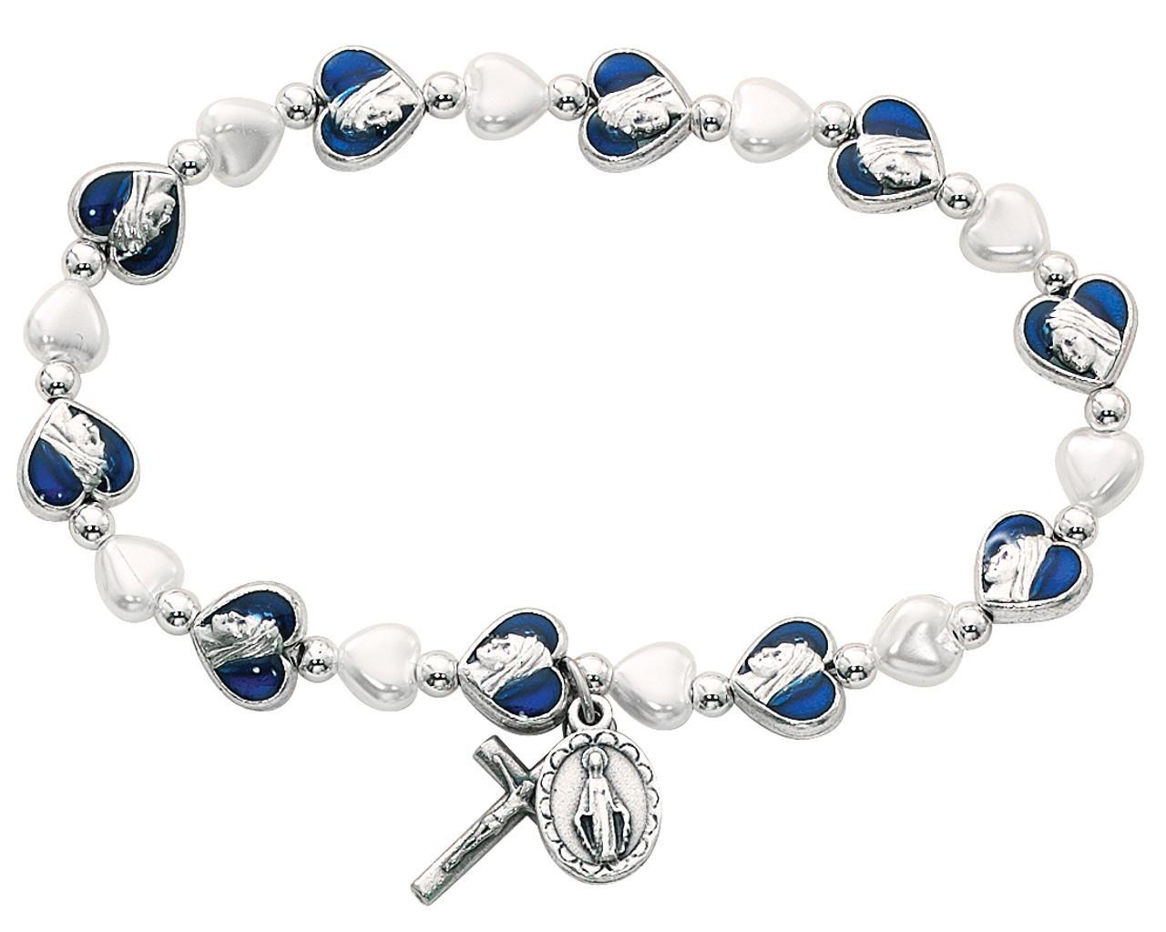 Blue Enameled Heart Beads, White Heart Pearl Glass Beads with Silver Oxidized Miraculous Medal and Crucifix attached. Stretch Bracelet fits Most wrists