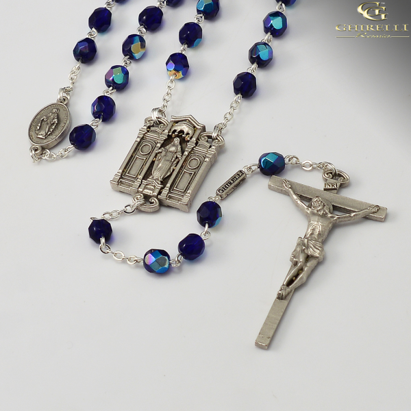 Rosary has faceted glass blue beads, with Exclusive Miraculous Medal Shrine and St. Catherine Laboure centerpiece. Also has the Replica of the Crucifixion that is in the Upper Shrine as the Crucifix. This 3rd Class Relic has been touched to the cloth of the Chair upon which Our Lady sat when she appeared to St. Catherine Laboure at the Motherhouse Chapel at Rue du Bac, Paris, France, on July 18,1830.