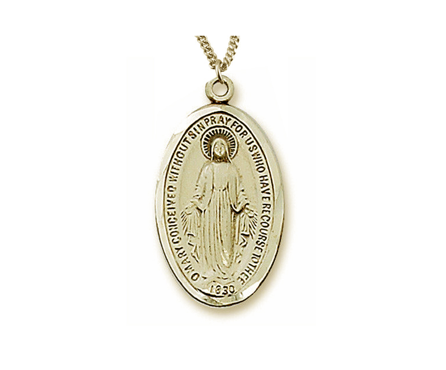 18 kt. Gold over Sterling-silver Miraculous Medal. 1″ long on 18-inch Gold-plated chain. Deluxe gift box.