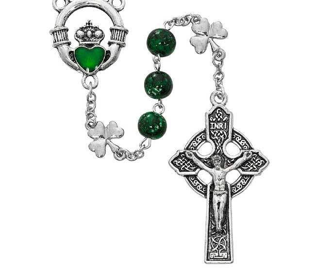 Green Shamrock Rosary is a beautiful Rosary made of Emerald Green Glass beads with Silver Shamrock Our Father beads, Green Enameled Claddagh centerpiece, and a Celtic crucifix. Rosary bead size is 8mm.