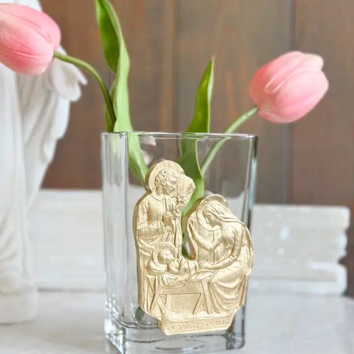 At the heart of this exquisite vase is a stunning gold emblem portraying the Holy Family. The intricate detailing captures a tender moment between Mary, Joseph, and the infant Jesus, rendered in a warm, radiant gold that catches the light beautifully. This central motif transforms the vase from a simple decorative item into a profound symbol of love, unity, and spiritual devotion.