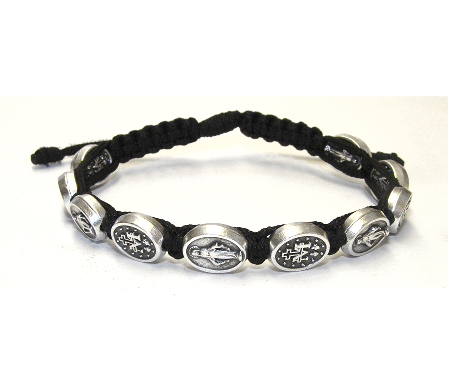 Black cord Rosary bracelet. Has 10 Miraculous Medals. Comes with prayer card. Adjustable, fits most adult wrists.