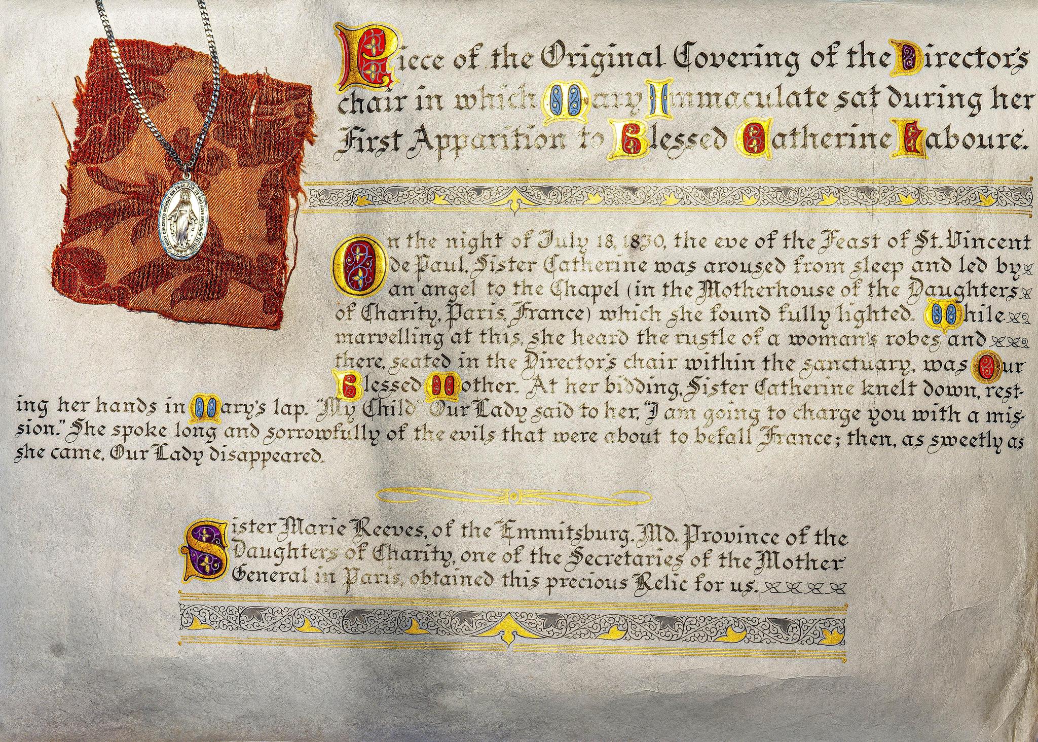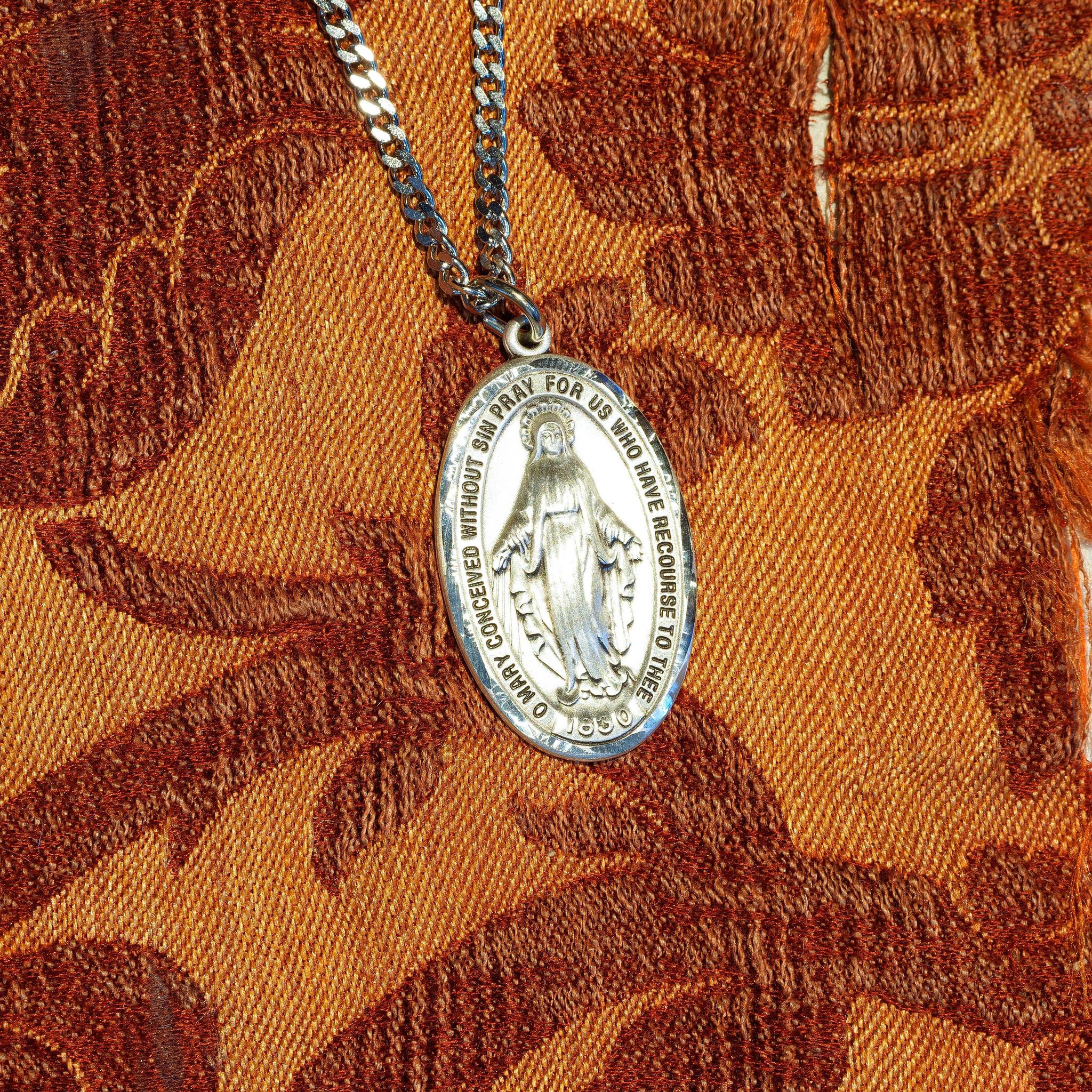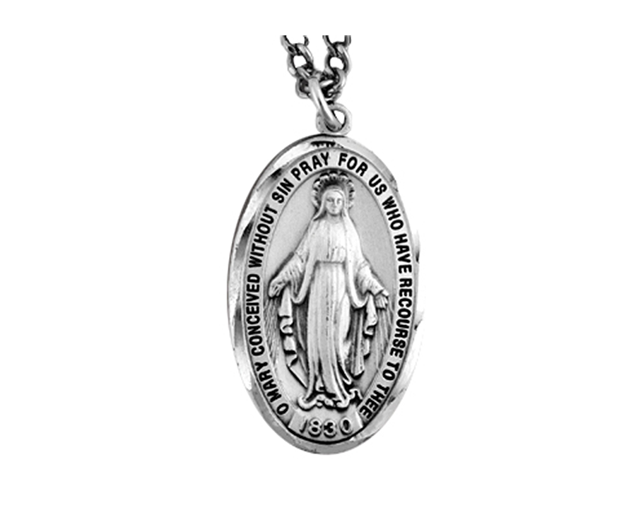 Sterling-Silver Classic Miraculous Medal on a 27″ Stainless Endless Chain. This 3rd Class Relic has been touched to the cloth of the Chair upon which Our Lady sat when she appeared to St. Catherine Laboure at the Motherhouse Chapel at Rue du Bac, Paris, France, on July 18,1830.