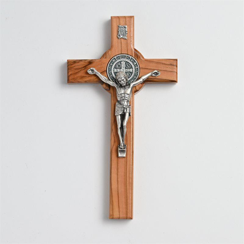 Beautiful Crucifix with St. Benedict Medal and Olive Wood from the Holy Land. Size: 6 1/4″ H Hangs on the Wall