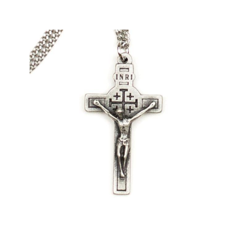 This Pewter Crucifix has Relic on back that has touched the Tomb of Jesus in Jerusalem and comes on a 20″ inch chain.