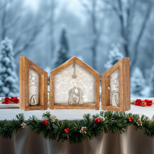 This folding display triptych frames the nativity scene with a spectacular hanging star over newborn Jesus, praising angels, and overjoyed parents, Mary and Joseph.