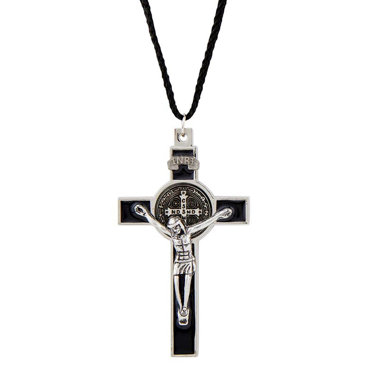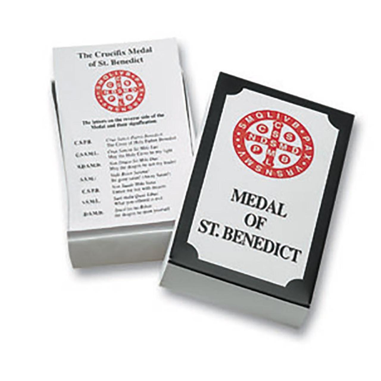 The St. Benedict medal contains symbols and text related to the life of St. Benedict of Nursia and is used invoke protection from spiritual and physical dangers.
