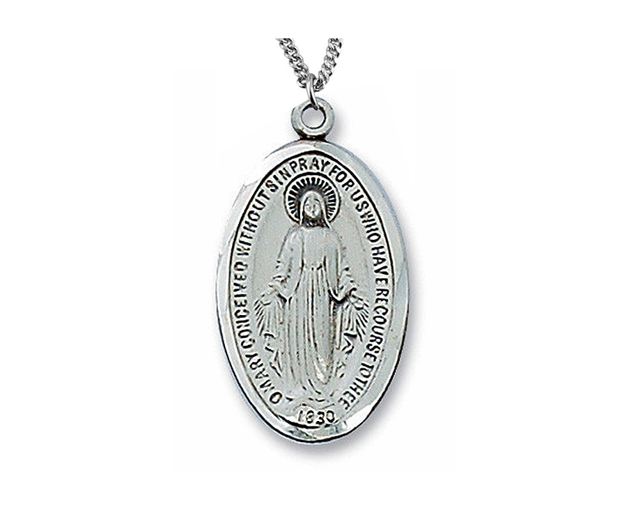 1″ Sterling-silver Miraculous Medal with 18″ Rhodium-plated chain. Deluxe Gift Boxed.
