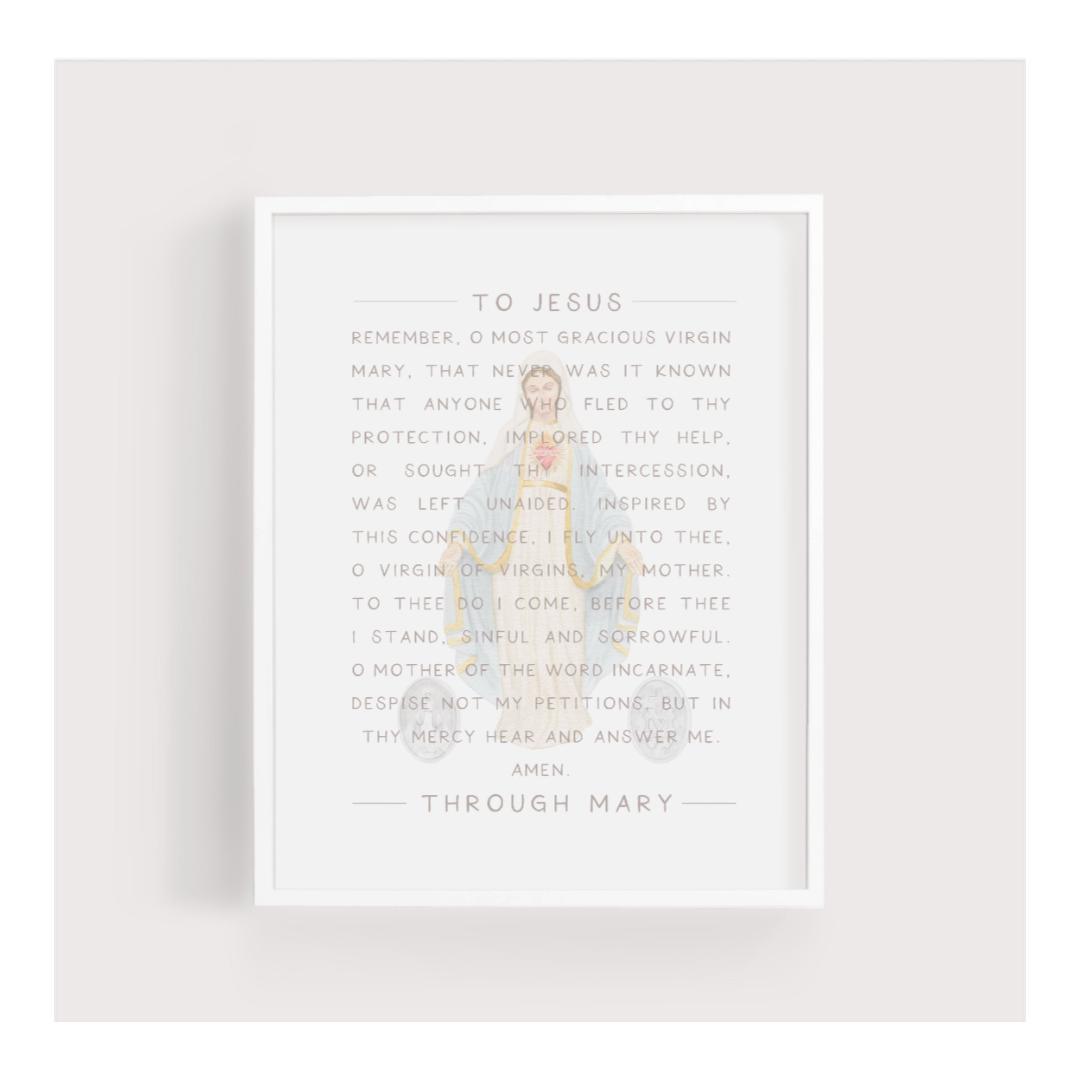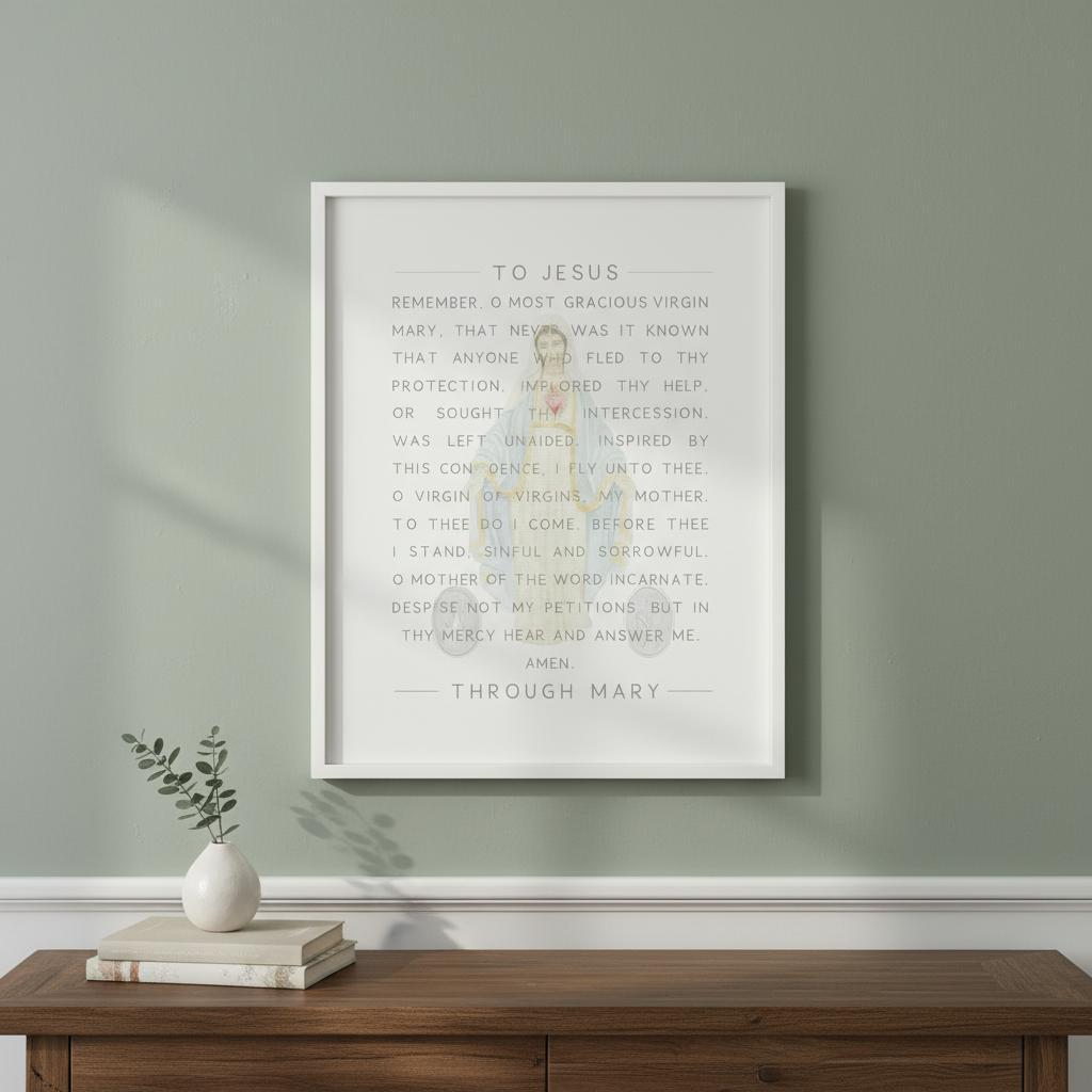This unique piece elegantly weaves together powerful symbols of Marian devotion. It features the beloved Memorare prayer, inviting you to seek the intercession of the Blessed Mother. The artwork is thoughtfully composed with serene images of Mary, the iconic Miraculous Medal, and the tender Sacred Heart of Jesus, creating a focal point for prayer and reflection in any room.